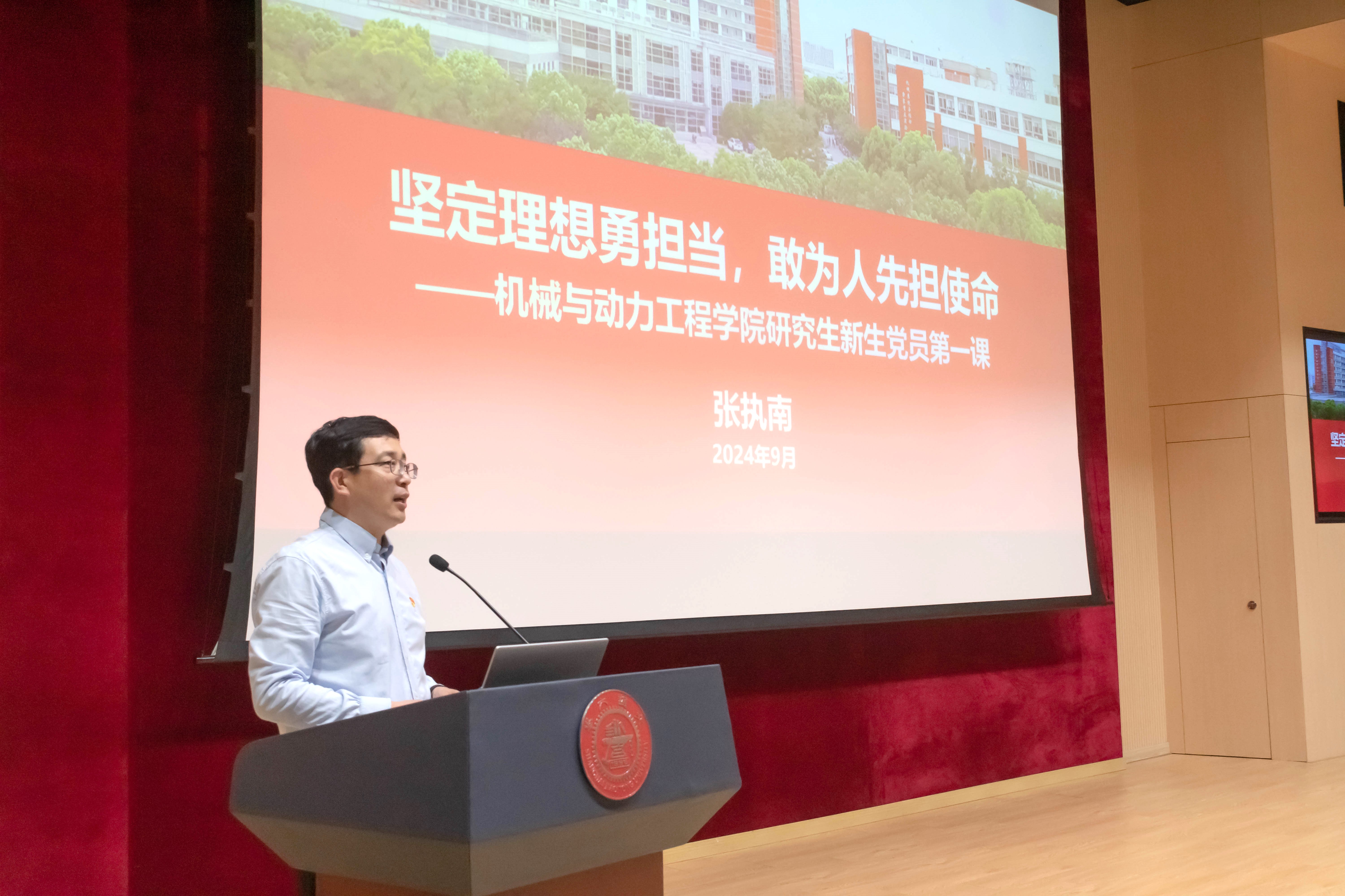 张执南以“坚定理想勇担当,敢为人先担使命”为主题开展专题党课,结合自身在交大求学以及教学科研工作的经历,对新生党员提出三点期望和要求。一是要坚定理想信念,强化使命担当奉献。他带领大家回顾交大人的红色基因,通过分享导师谢友柏院士教书育人、严谨治学的故事以及优秀校友的求学经历,鼓励大家养成踏实认真的为人处事态度和严谨求实的科学研究精神。二是要锤炼过硬本领,与国同向同行。他结合两位博士毕业生的求学经历和职业发展,希望大家秉持赤子之心,不忘家国情怀,夯实专业基础,培养系统思维能力,未来在国家需要的前沿领域实现自身价值。三是要强化服务意识,发挥先锋示范引领。他分享了优秀毕业生党员的事迹,号召新生党员发挥模范引领作用,在日常点滴中践行“为人民服务”的宗旨,在关键时刻挺膺担当,将青春奋斗融入党和人民的事业中。