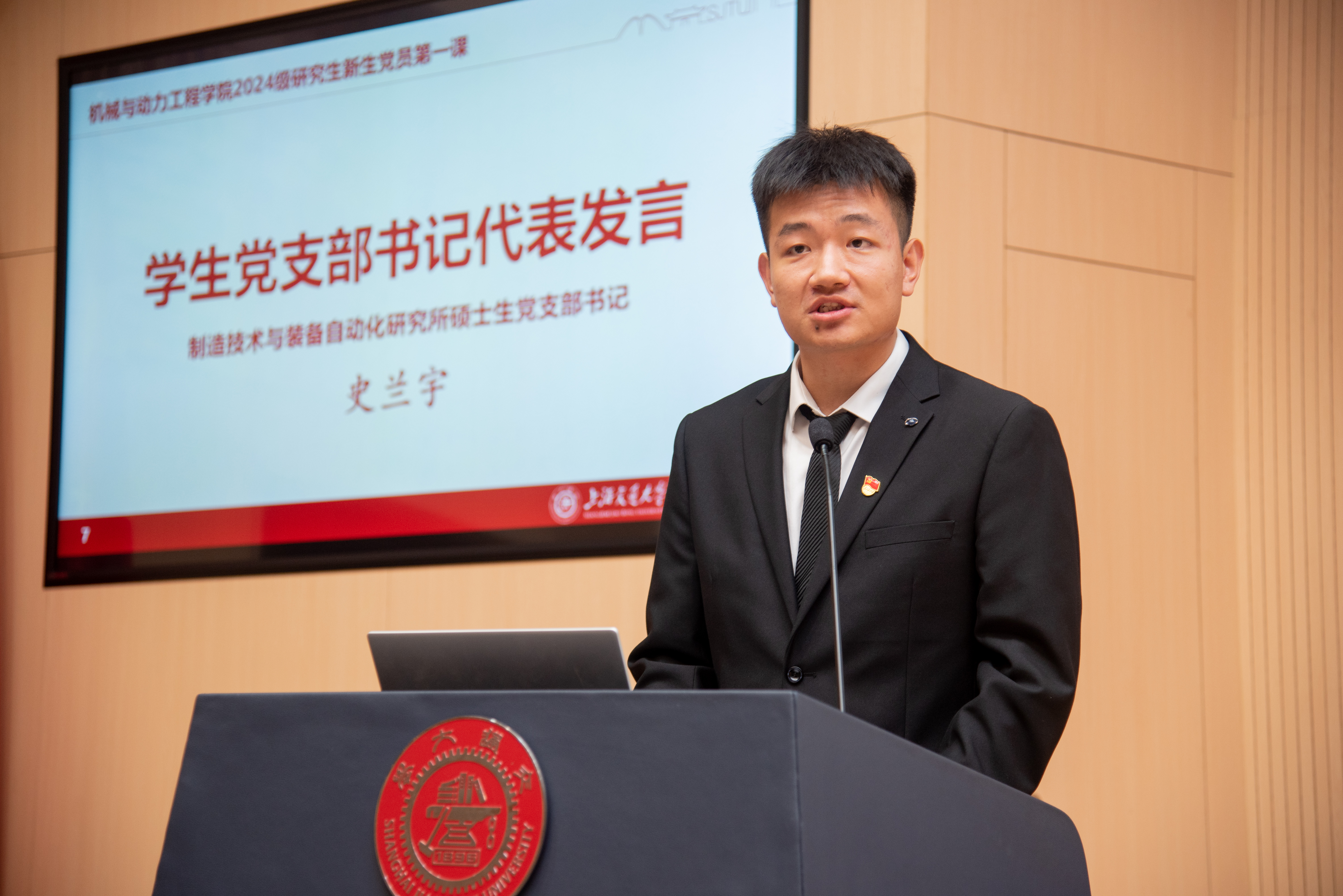2024级博士研究生、制造技术与装备研究所硕士生党支部书记史兰宇作为学生党支部书记代表分享了成长感悟以及在科研道路上不断突破自我、勇攀高峰的心路历程,鼓励新生党员志存高远、潜心钻研、勇于探索,不断拓宽自己的知识边界和思维疆域,以实际行动报效祖国,彰显青年担当。