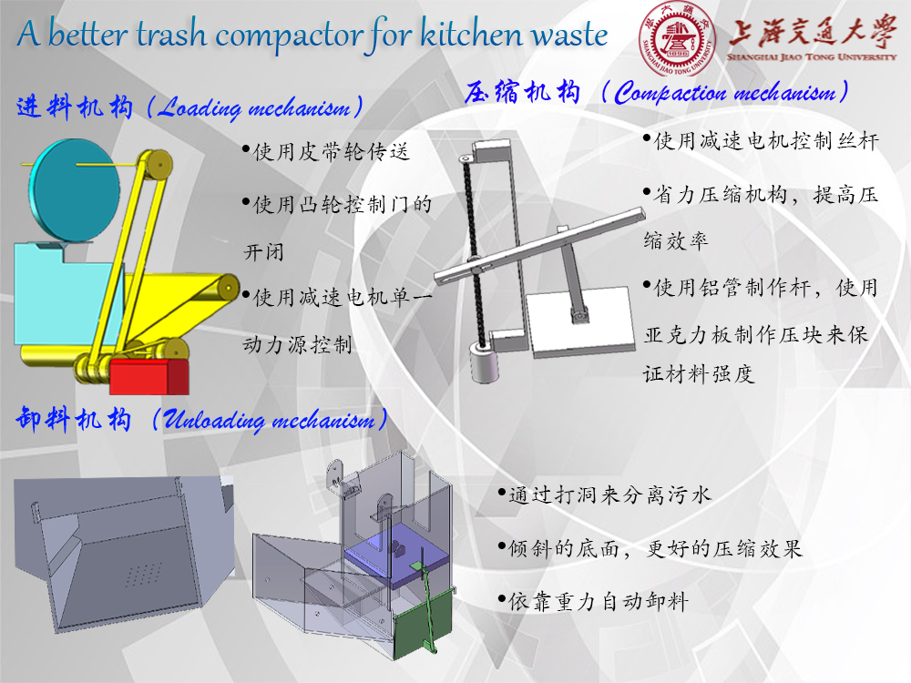 (1)设计一个安全有效的厨余垃圾压缩器,将进料、压缩、卸料功能一体化。