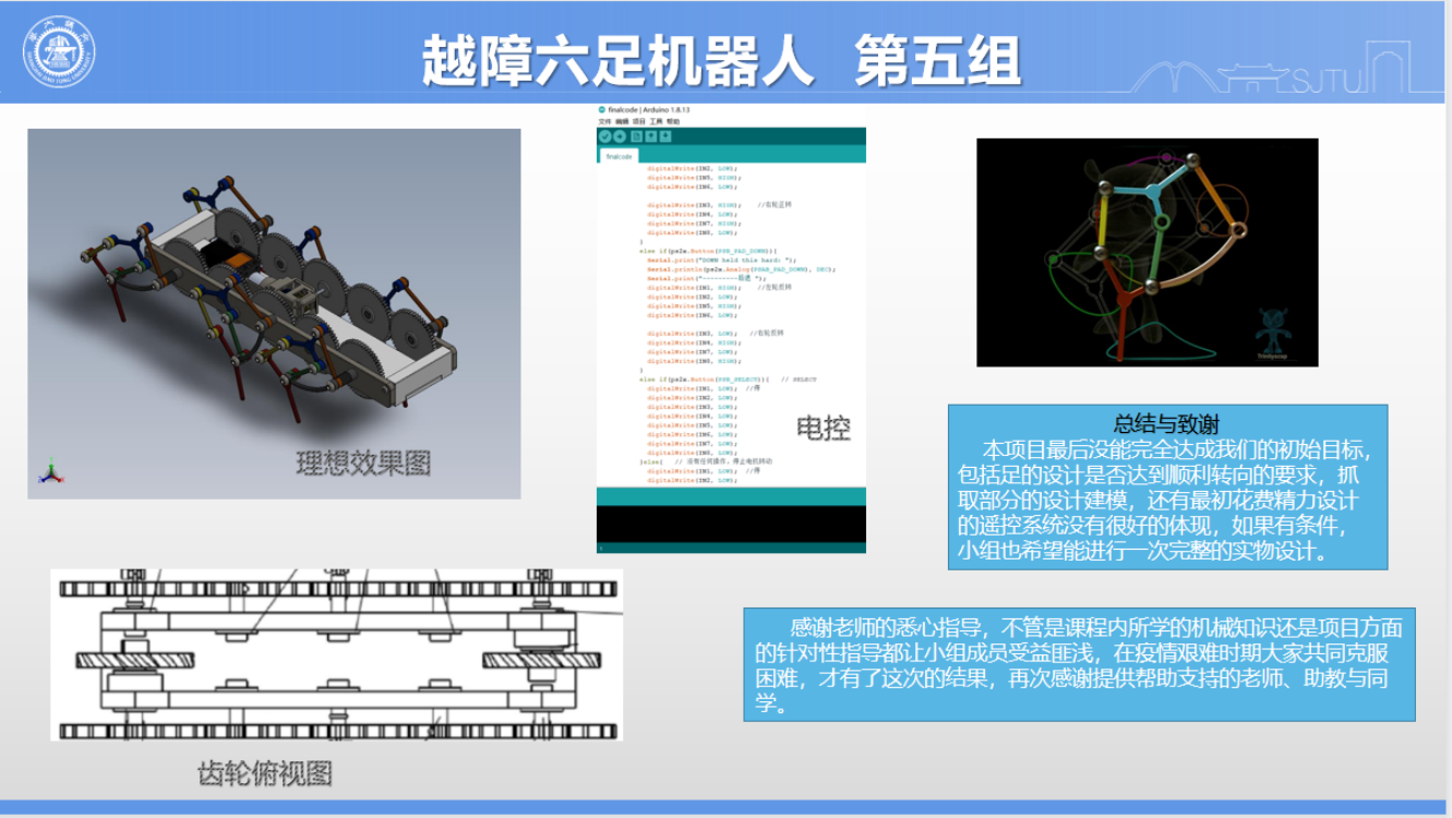 本次设计由于疫情虽无实物成品,但已作出设计图纸与虚拟机模拟。设计最终运用多种机械结构相互配合传动减少了舵机与电机的需求,使得机器人重量、成本都有所控制;同时材料的选取也符合机器人强度以及实际情况,制作相对简单;预计可以稳定地跨越带有一定坡度的地形以及一些颠簸地形;三角步态通过对结构的设计得以实现;遥控与机器人运动控制部分已用代码实现,可进行远距离稳定的操控;搬运部分能以搭载机械爪的形式运送质量较小的物品。