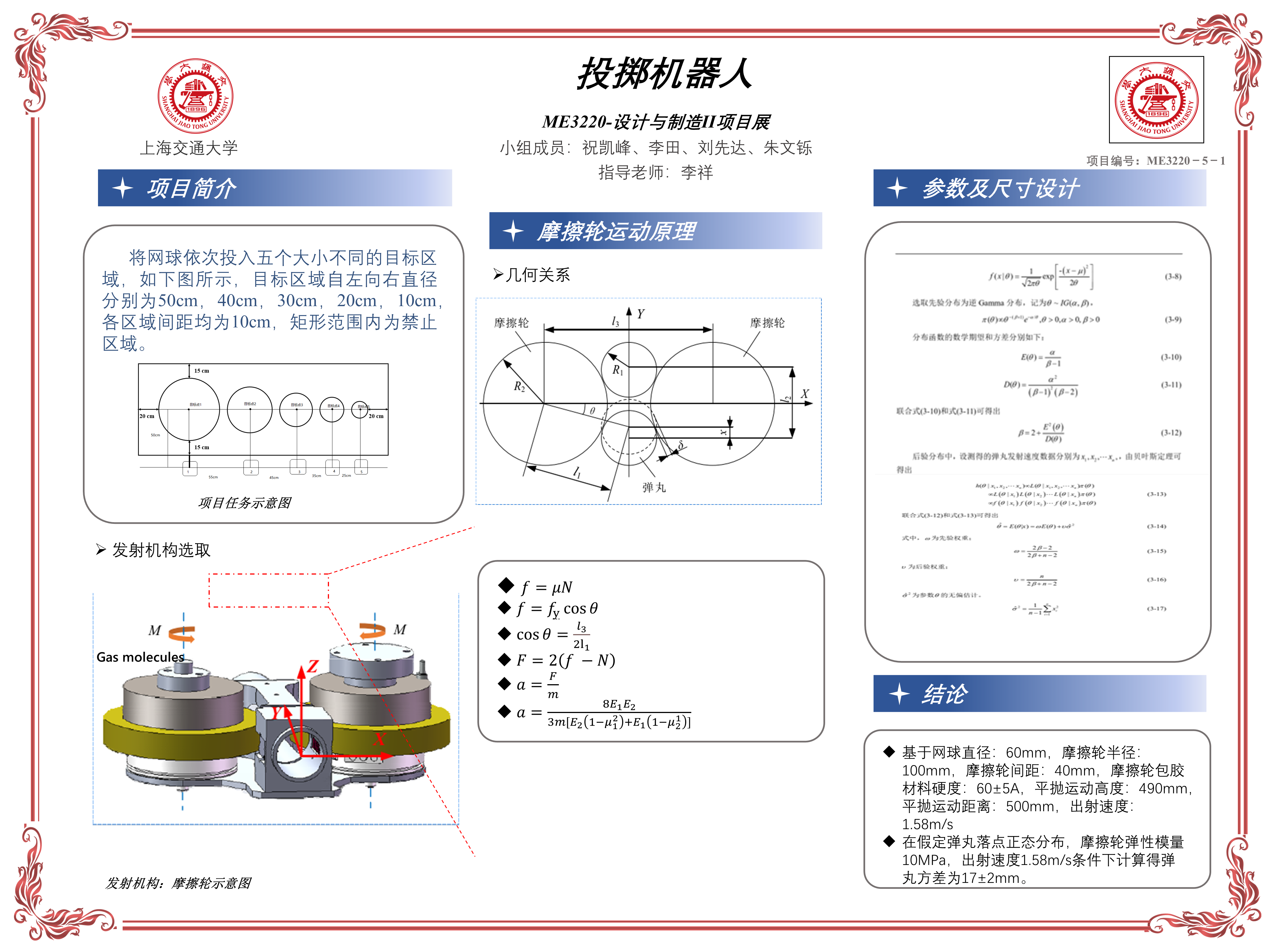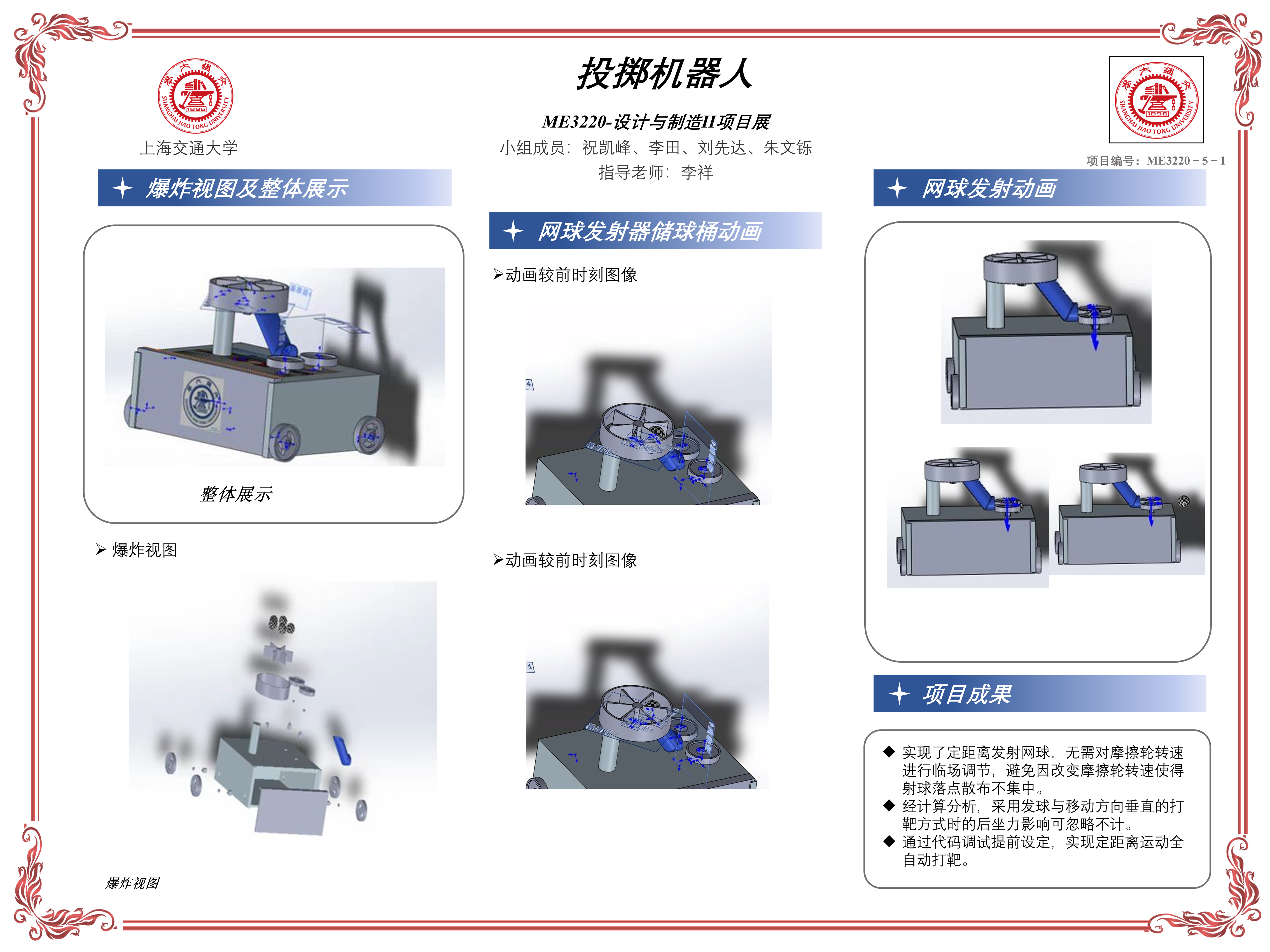 通过储球结构储存储多个网球。然后用摩擦轮传动装置对网球进行发射。加装底部轮胎使得装置能够进行横向运动。通过电控代码程序控制网球的发射及底部运动。使得投篮机器人能够依次在不同点位向目标区域之中投入网球。以做到精准地将五个网球分别投入五个大小不同的目标区域,并再挑战赛要求的时限内完成打靶。受限于线上项目的展开,模拟打靶的情况进行数据分析,通过SolidWorks建模代替实物制作并通过动画进行演示。