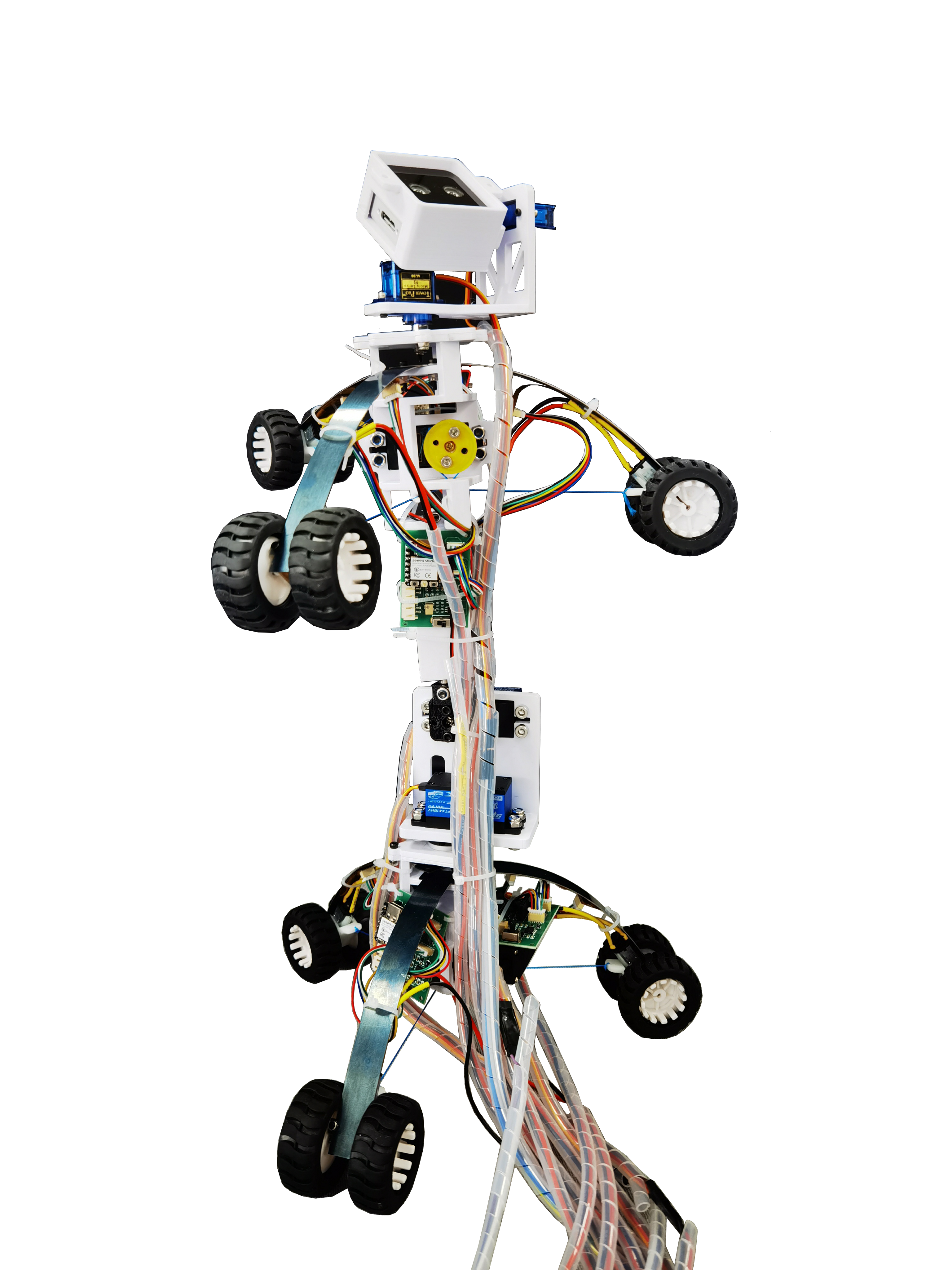 项目设计了一款柔性杆整体张拉内孔爬行机器人,能够实现复杂管道轮腿双模式运动和障碍缺陷识别。项目设计了刚柔耦合整体张拉机构,实现轮式、蠕动双运动模式;建立绳索-柔性杆件联合解算模型,实现柔性杆末端控制;搭建“视触”多维度环境实时感知系统,实现缺陷、障碍物实时检测和定位,并完成管道点云重建。项目基于“构型、建模、感知”三大创新和“机构、触觉、视觉、控制”四大技术路线,实现适应性强、实时感知的航空发动机内孔爬行机器人设计制造,满足企业需求。