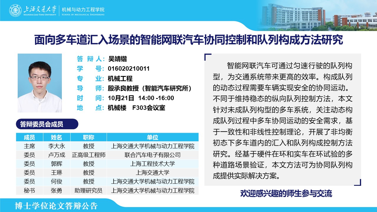 答辩人:吴靖锴| 导师:殷承良 | 时间:10月21日 14:00 – 16:00 | 地点:机械楼 F303会议室