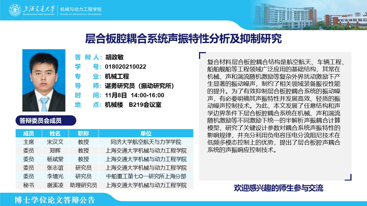 答辩人:胡政敏| 导师:谌勇 | 时间:11月08日 14:00 – 16:00 | 地点:机械楼 B219会议室