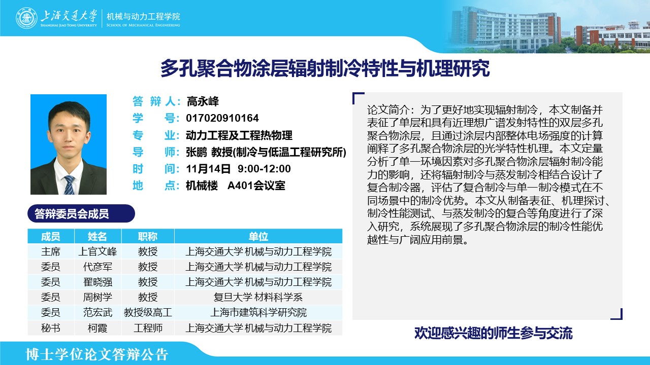 答辩人:高永峰| 导师:张鹏 | 时间:11月14日 9:00 – 12:00 | 地点:机械楼 A401会议室