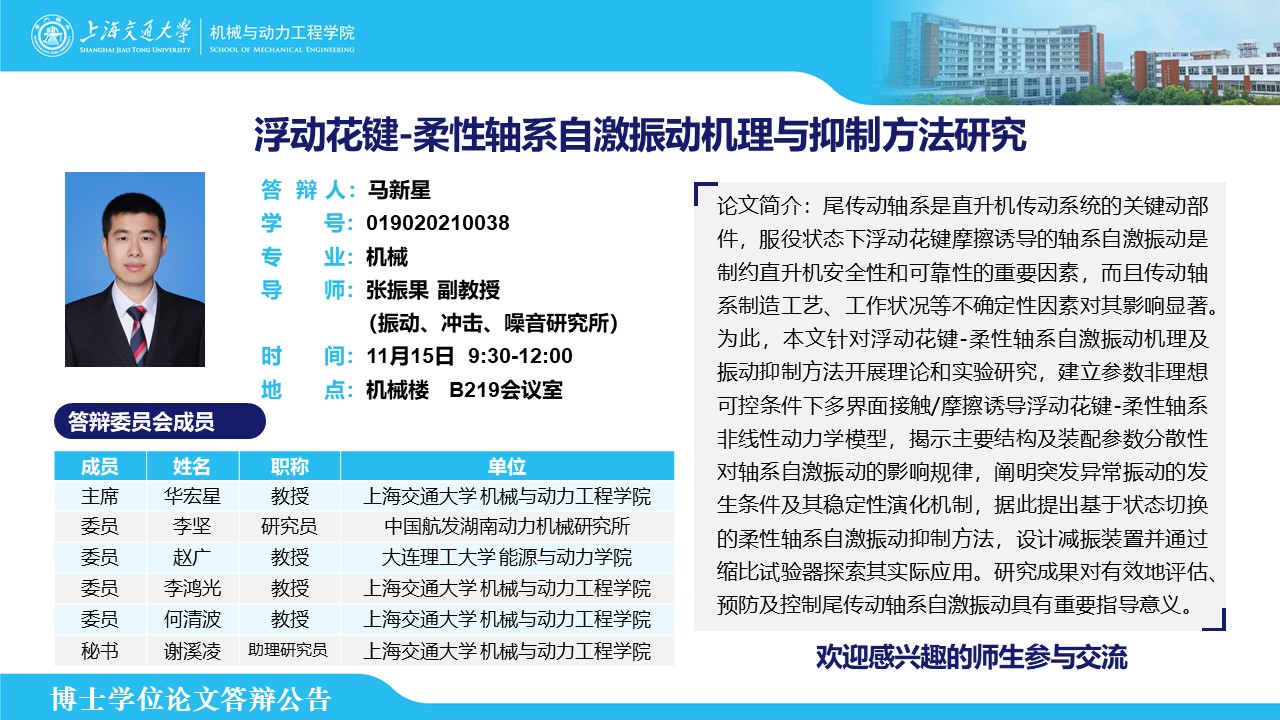 答辩人:马新星| 导师:张振果 | 时间:11月15日 9:30 – 12:00 | 地点:机械楼 B219会议室