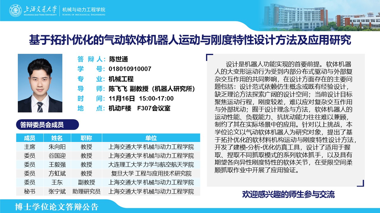 答辩人:陈世通| 导师:陈飞飞 | 时间:11月16日 15:00 – 17:00 | 地点:机械楼 F307会议室