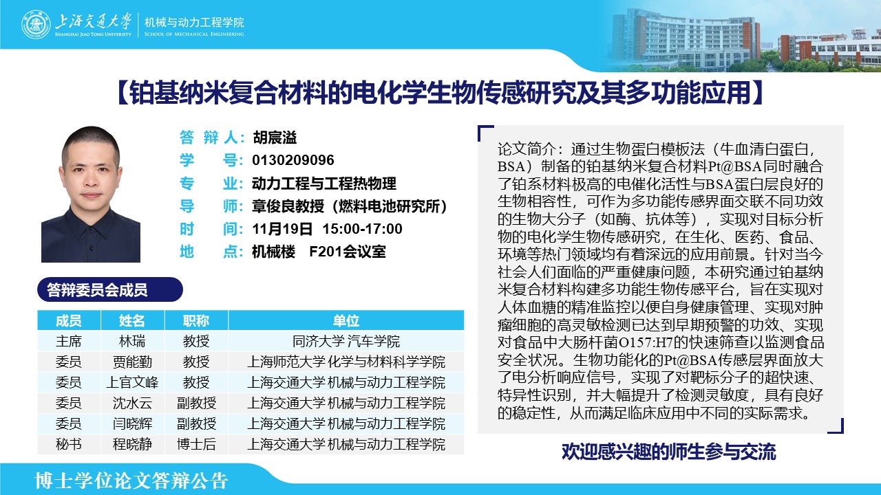 答辩人:胡宸溢| 导师:章俊良 | 时间:11月19日 15:00 – 17:00 | 地点:机械楼 F201会议室