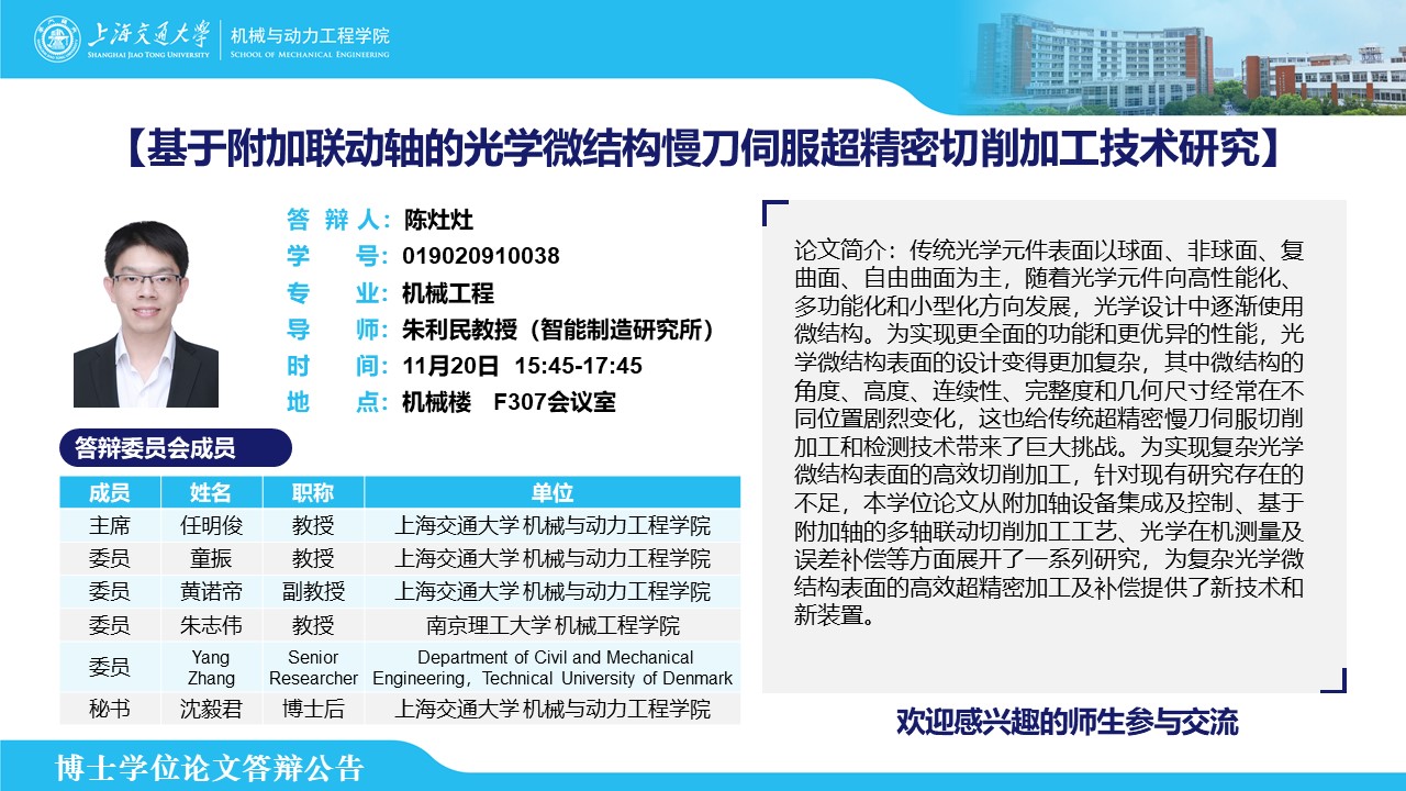 答辩人:陈灶灶| 导师:朱利民 | 时间:11月20日 15:45 – 17:45 | 地点:机械楼 F307会议室