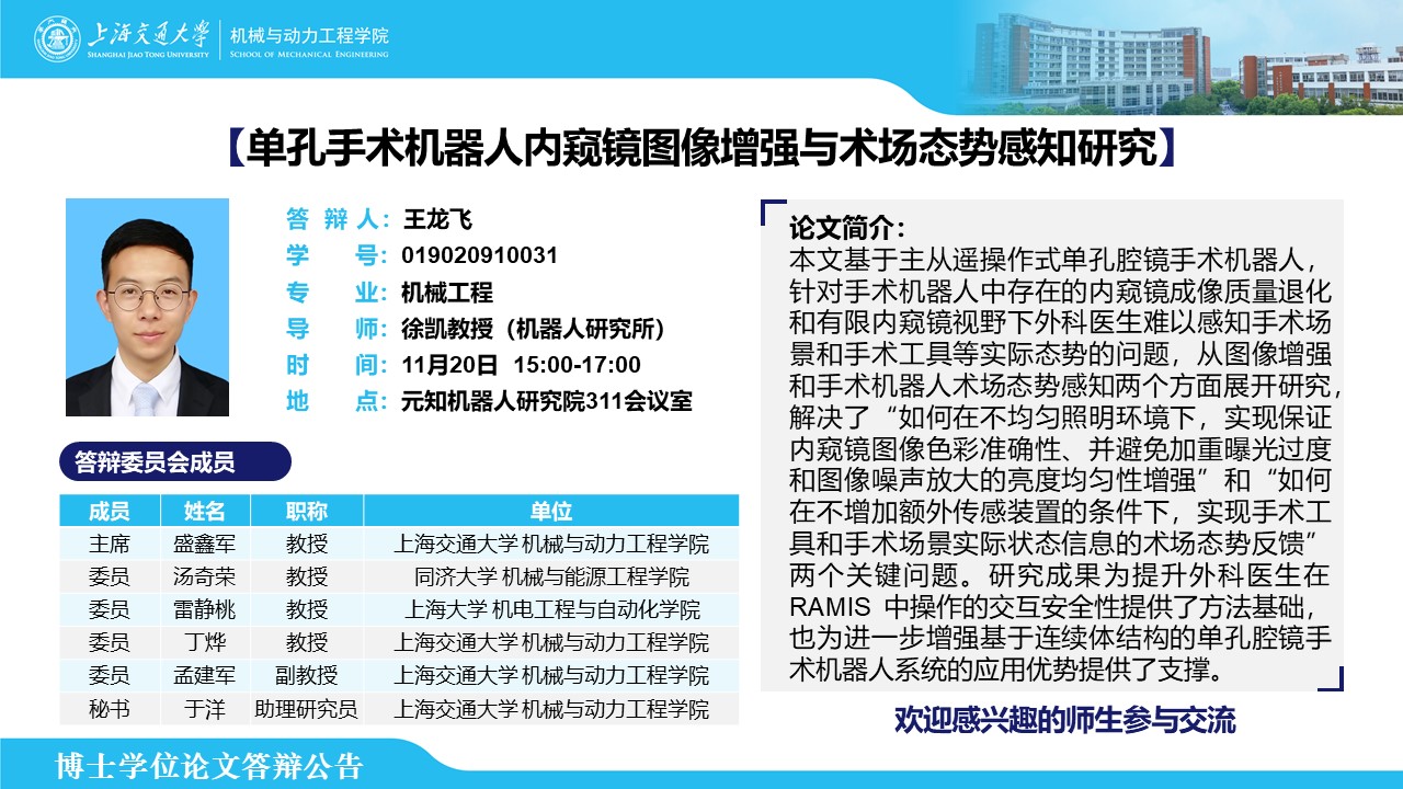 答辩人:王龙飞| 导师:徐凯 | 时间:11月20日 15:00 – 17:00 | 地点:元知机器人研究院311会议室
