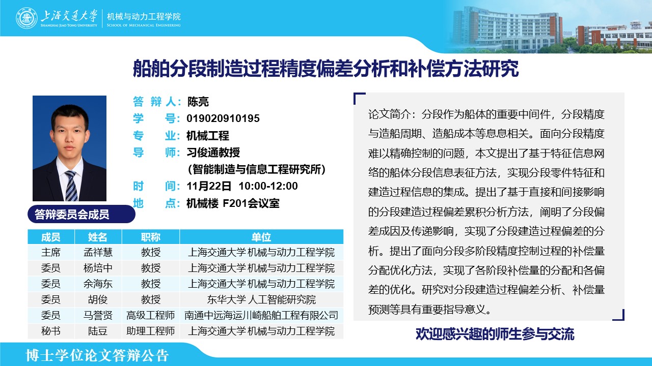 答辩人:陈亮| 导师:习俊通 | 时间:11月22日 10:00 – 12:00 | 地点:机械楼 F201会议室