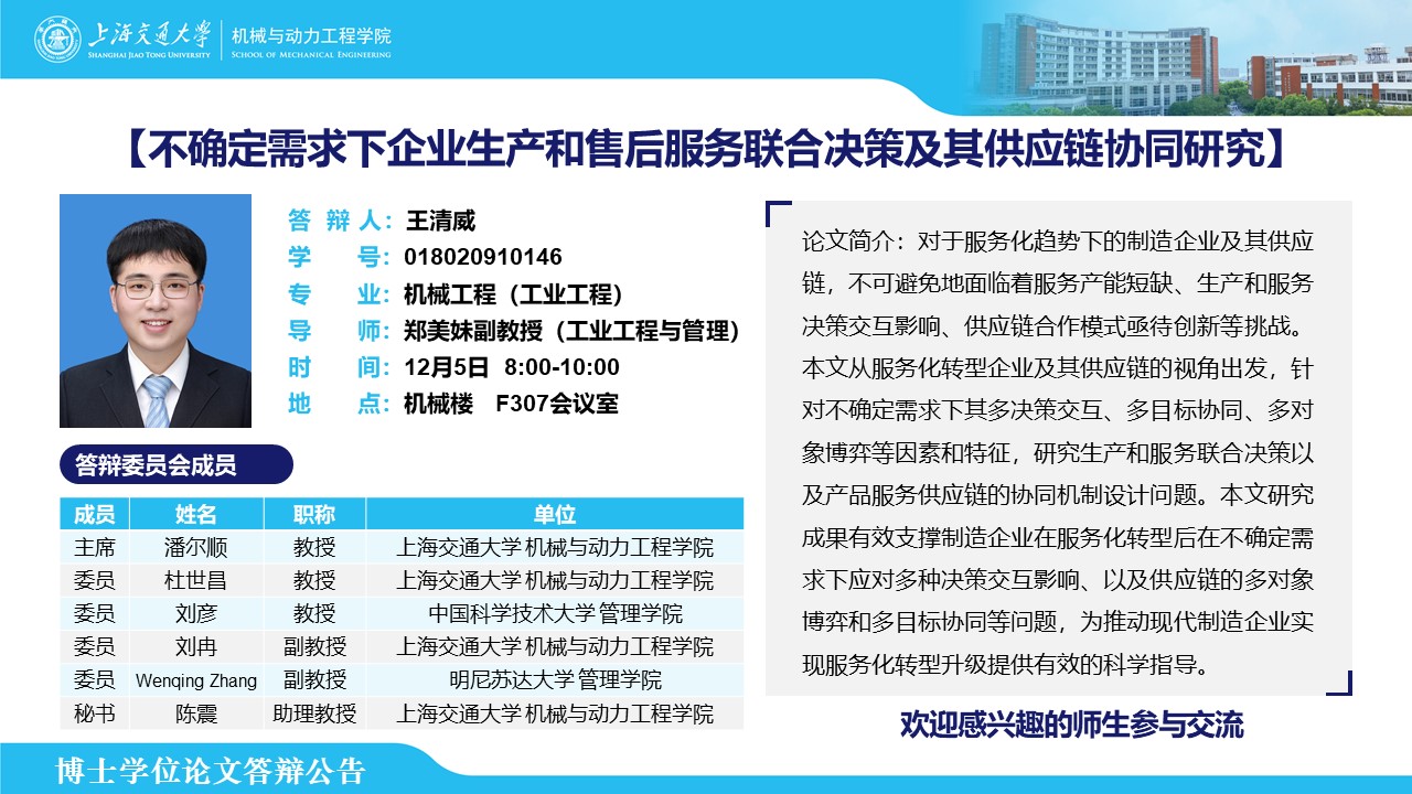 答辩人:王清威| 导师:郑美妹 | 时间:12月5日 8:00 – 10:00 | 地点:机械楼 F307会议室