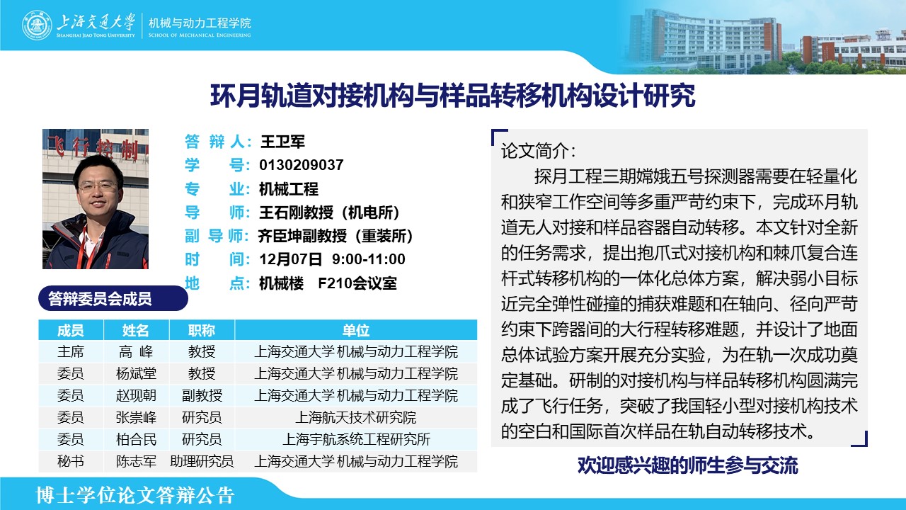 答辩人:王卫军| 导师:王石刚、齐臣坤 | 时间:12月7日 9:00 – 11:00 | 地点:机械楼 F210会议室