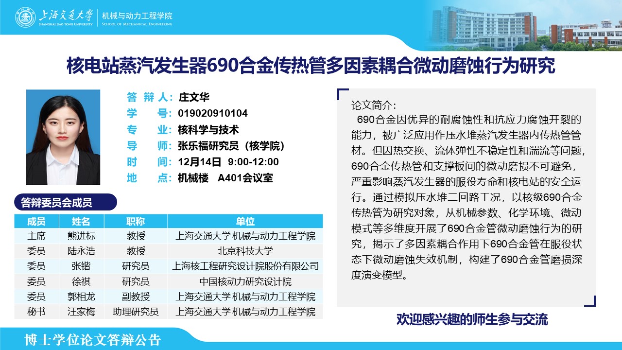 答辩人:庄文华| 导师:张乐福 | 时间:12月14日 9:00 – 12:00 | 地点:机械楼 A401会议室