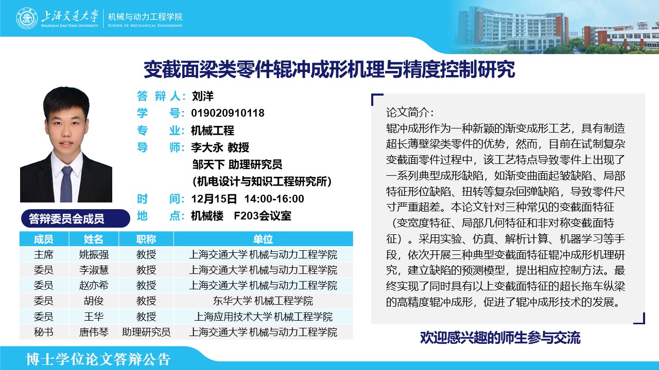 答辩人:刘洋| 导师:李大永、邹天下 | 时间:12月15日 14:00 – 16:00 | 地点:机械楼 F203会议室