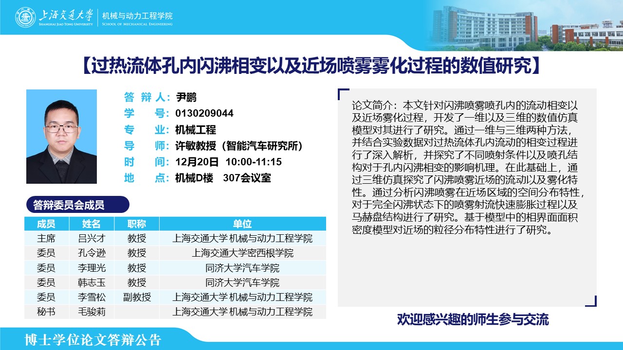 答辩人:尹鹏| 导师:许敏 | 时间:12月20日 10:00 – 11:15 | 地点:机械楼 D307会议室