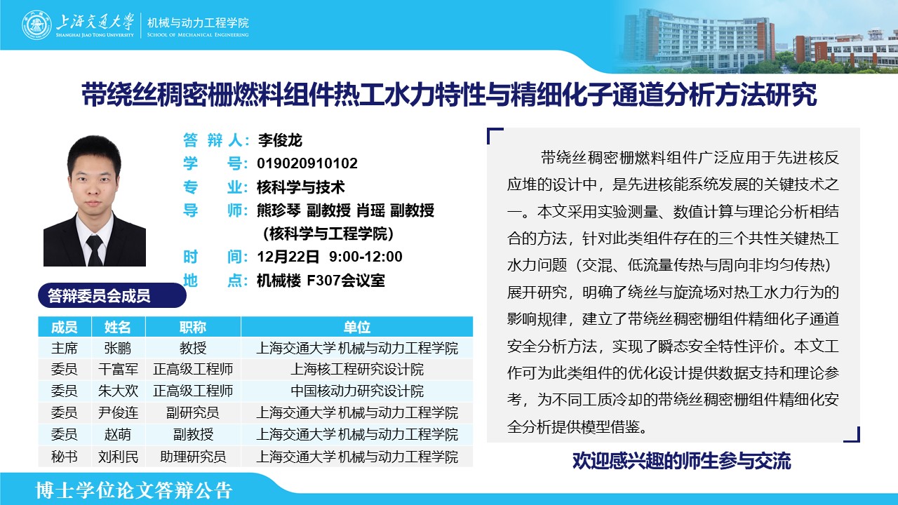 答辩人:李俊龙| 导师:熊珍琴、肖瑶 | 时间:12月22日 9:00 – 12:00 | 地点:机械楼 F307会议室