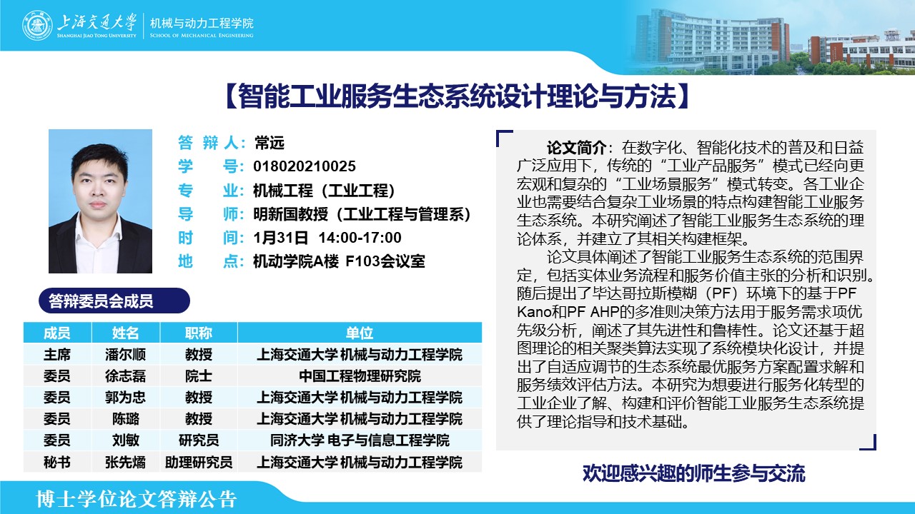 答辩人:常远 | 导师:明新国 | 时间:1月31日 14:00-17:00 | 地点:机械楼 F103会议室