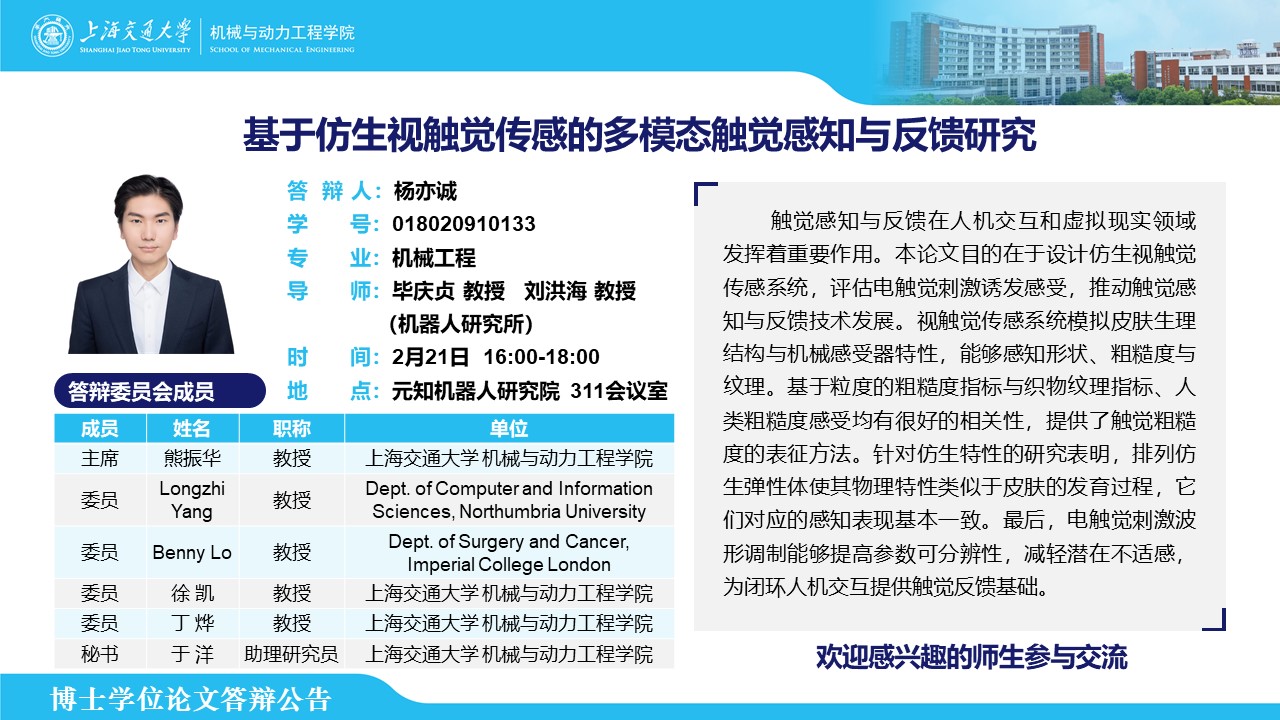 答辩人:杨亦诚 | 导师:毕庆贞、刘洪海 | 时间:2月21日 16:00-18:00 | 地点:元知机器人研究院 311会议室