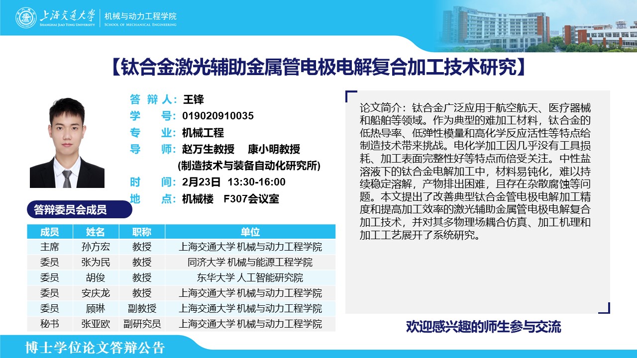 答辩人:王锋 | 导师:赵万生、康小明 | 时间:2月23日 13:30-16:00 | 地点:机械楼 F307会议室