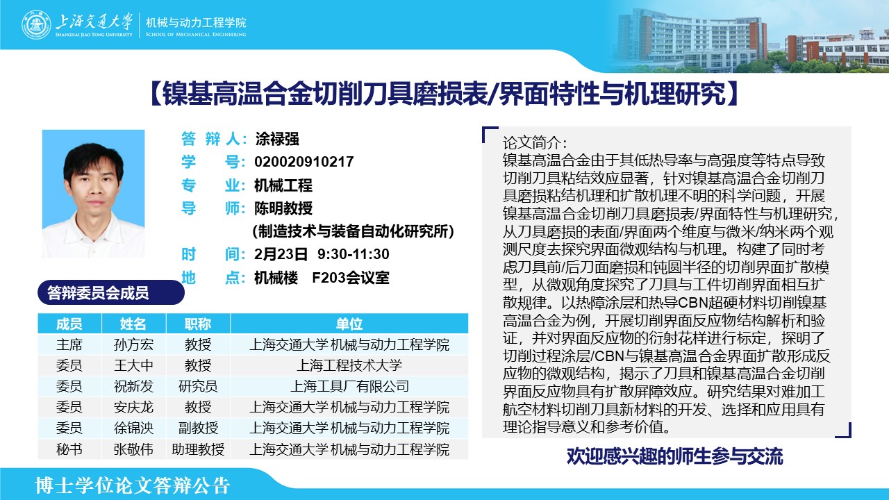 答辩人:涂禄强 | 导师:陈明 | 时间:2月23日 9:30-11:30 | 地点:机械楼 F203会议室