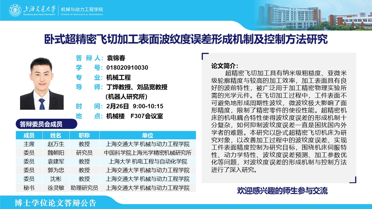 答辩人:袁锦春 | 导师:丁烨、刘品宽 | 时间:2月26日 9:00-10:15 | 地点:机械楼 F307会议室