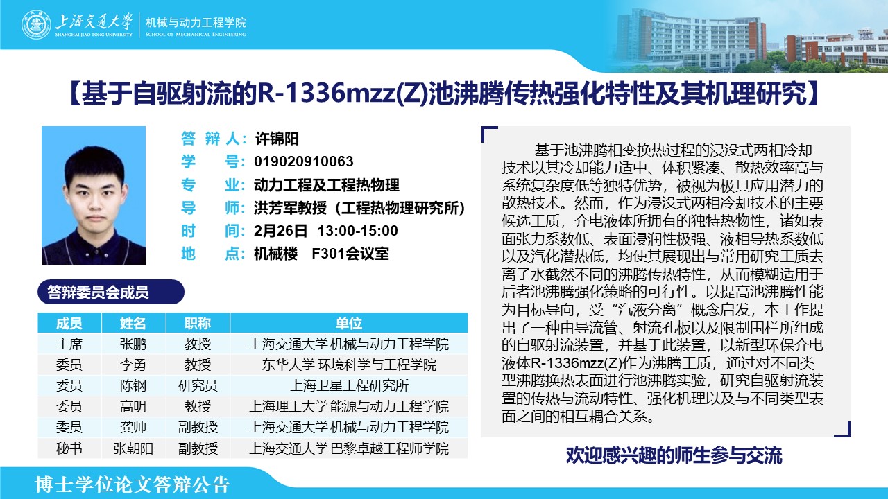 答辩人:许锦阳 | 导师:洪芳军 | 时间:2月26日 13:00-15:00 | 地点:机械楼 F301会议室