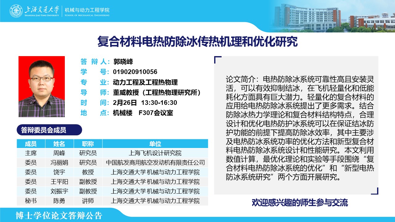 答辩人:郭晓峰 | 导师:董威 | 时间:2月26日 13:30-16:30 | 地点:机械楼 F307会议室