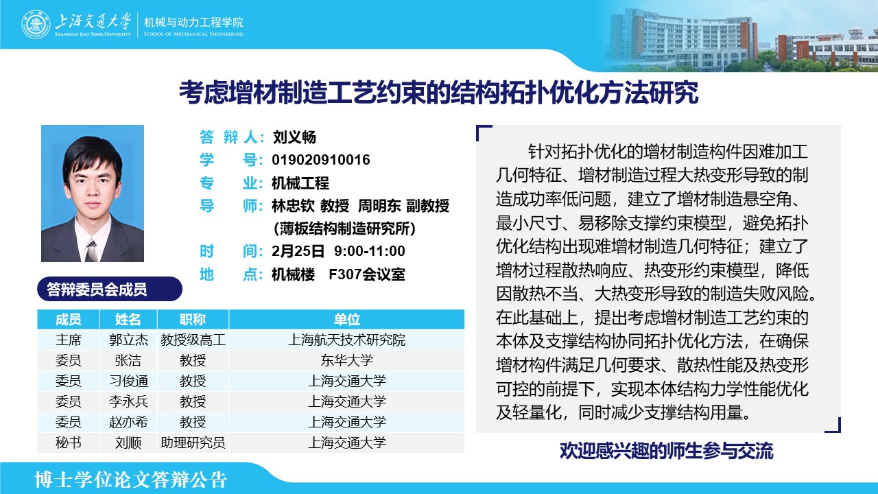 答辩人:刘义畅 | 导师:林忠钦、周明东 | 时间:2月25日 9:00-11:00 | 地点:机械楼 F307会议室