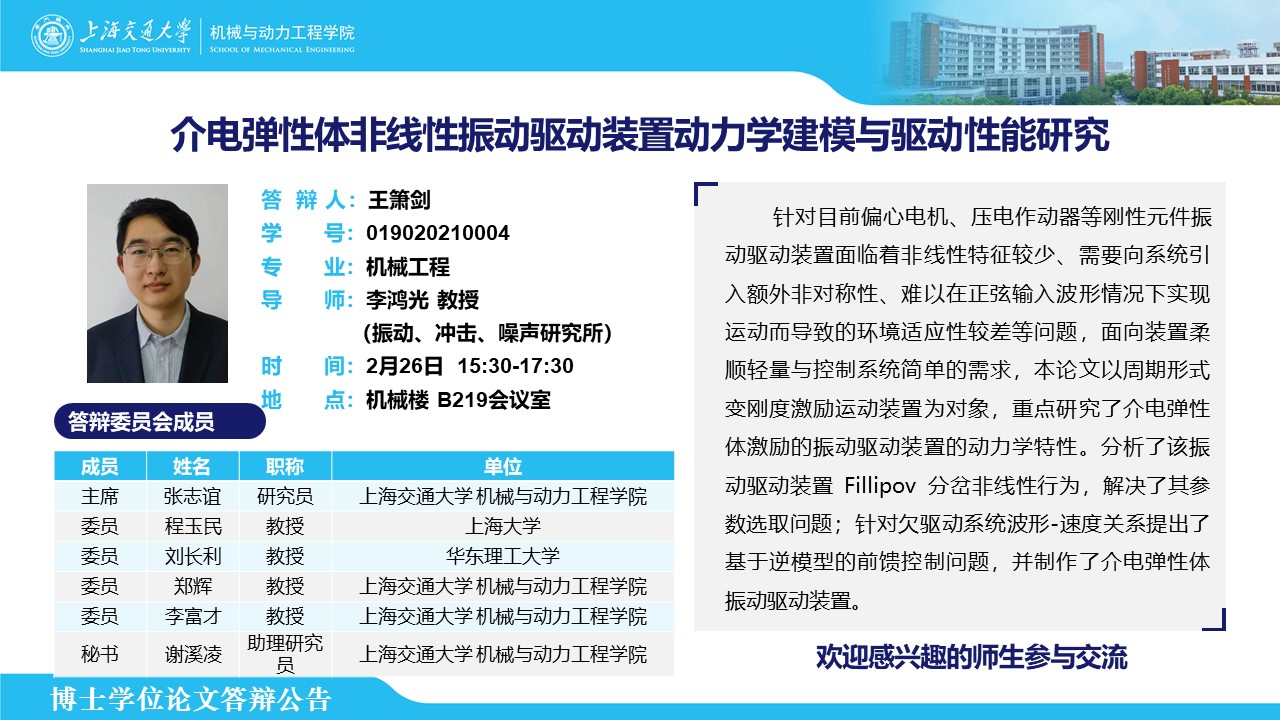 答辩人:王箫剑 | 导师:李鸿光 | 时间:2月26日 15:30-17:30 | 地点:机械楼 B219会议室