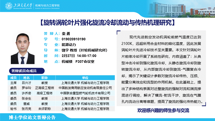 答辩人:栾勇 | 导师:饶宇 | 时间:2月27日 14:00-17:00 | 地点:机械楼 F307会议室