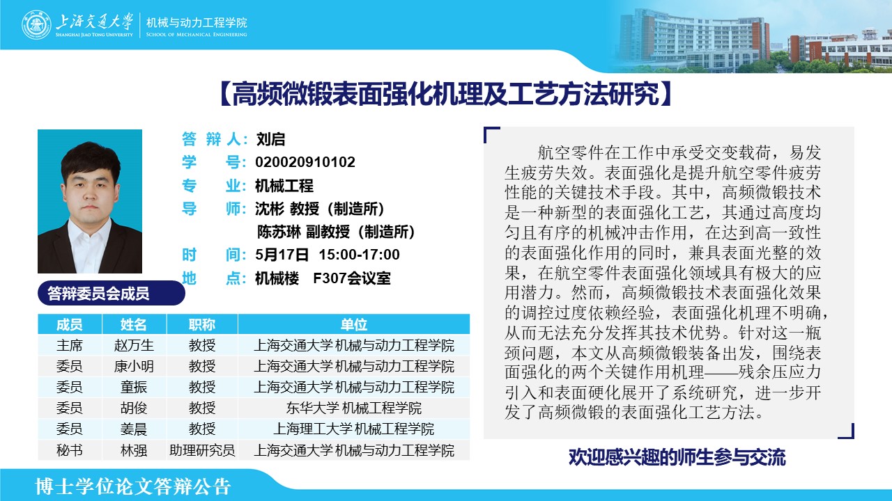 答辩人:刘启 | 导师:沈彬、陈苏琳 | 时间:5月17日 15:00-17:00 | 地点:机械楼 F307会议室