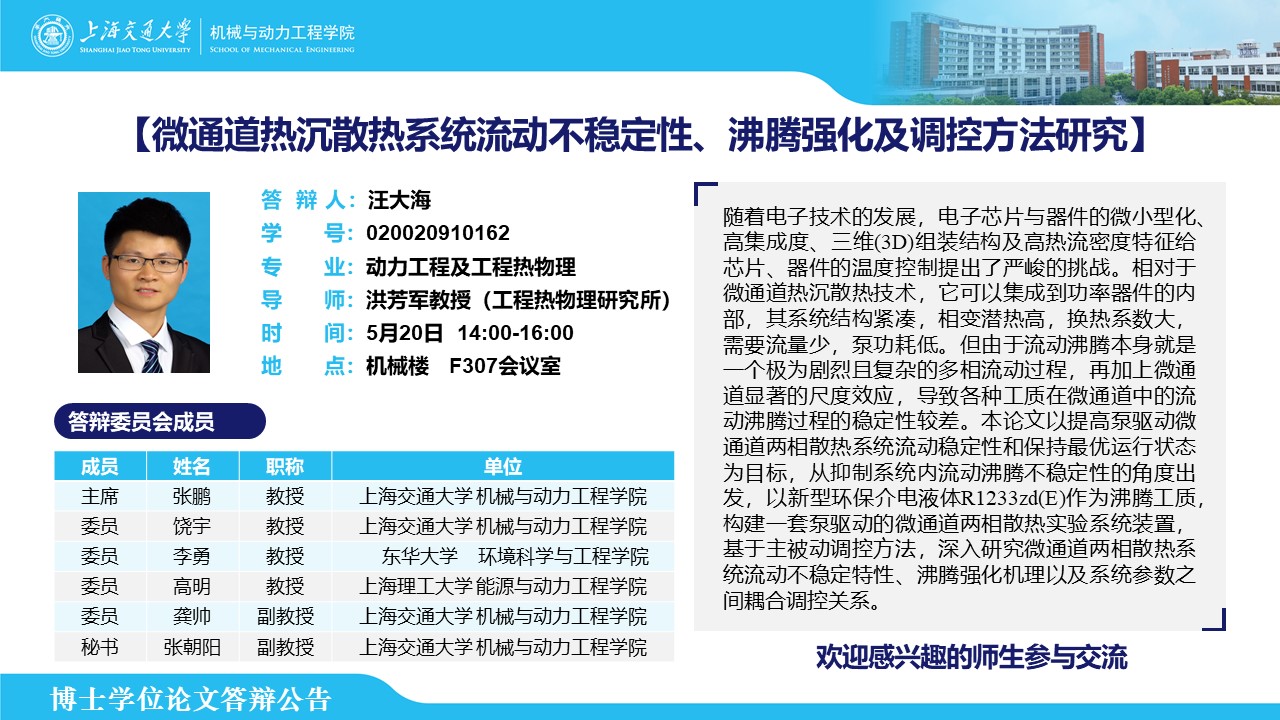 答辩人:汪大海 | 导师:洪芳军 | 时间:5月20日 14:00-16:00 | 地点:机械楼 F307会议室