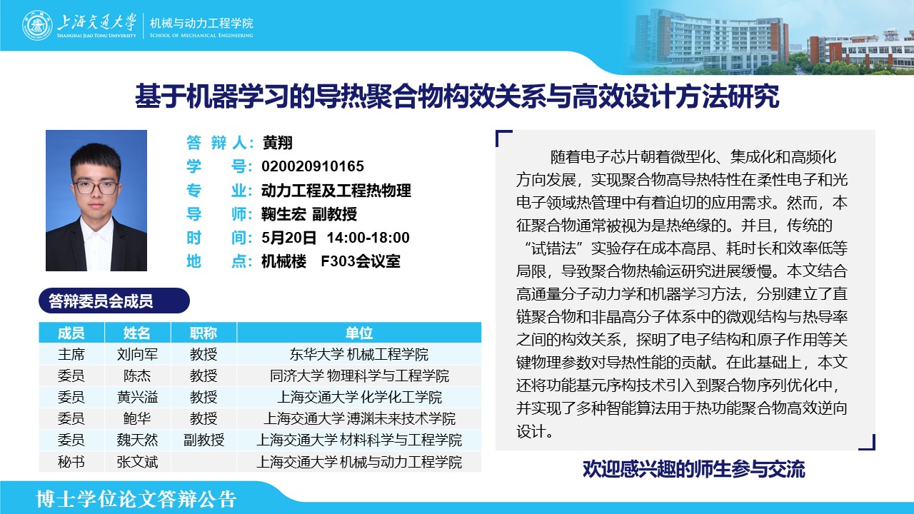 答辩人:黄翔 | 导师:鞠生宏 | 时间:5月20日 14:00-18:00 | 地点:机械楼 F303会议室