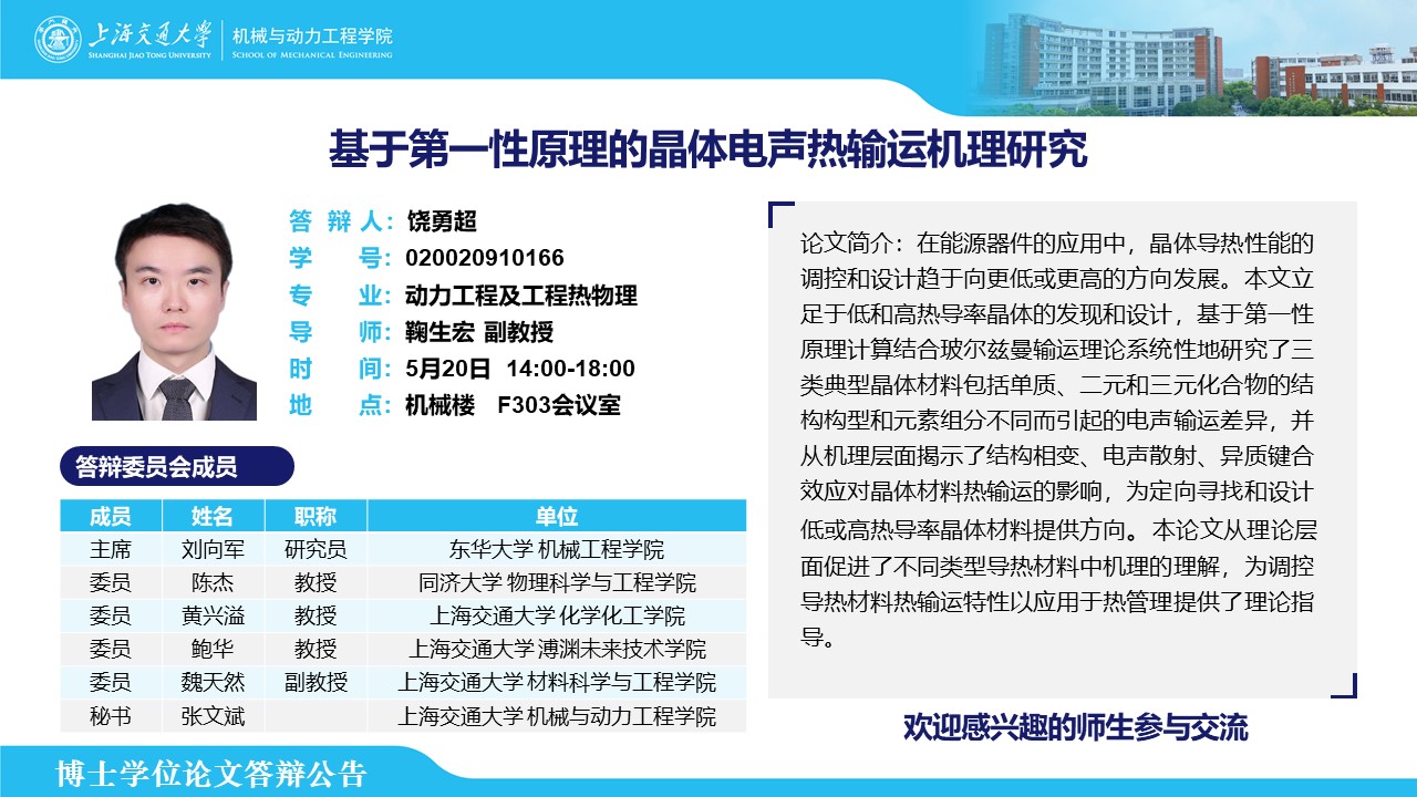 答辩人:饶勇超 | 导师:鞠生宏 | 时间:5月20日 14:00-18:00 | 地点:机械楼 F303会议室