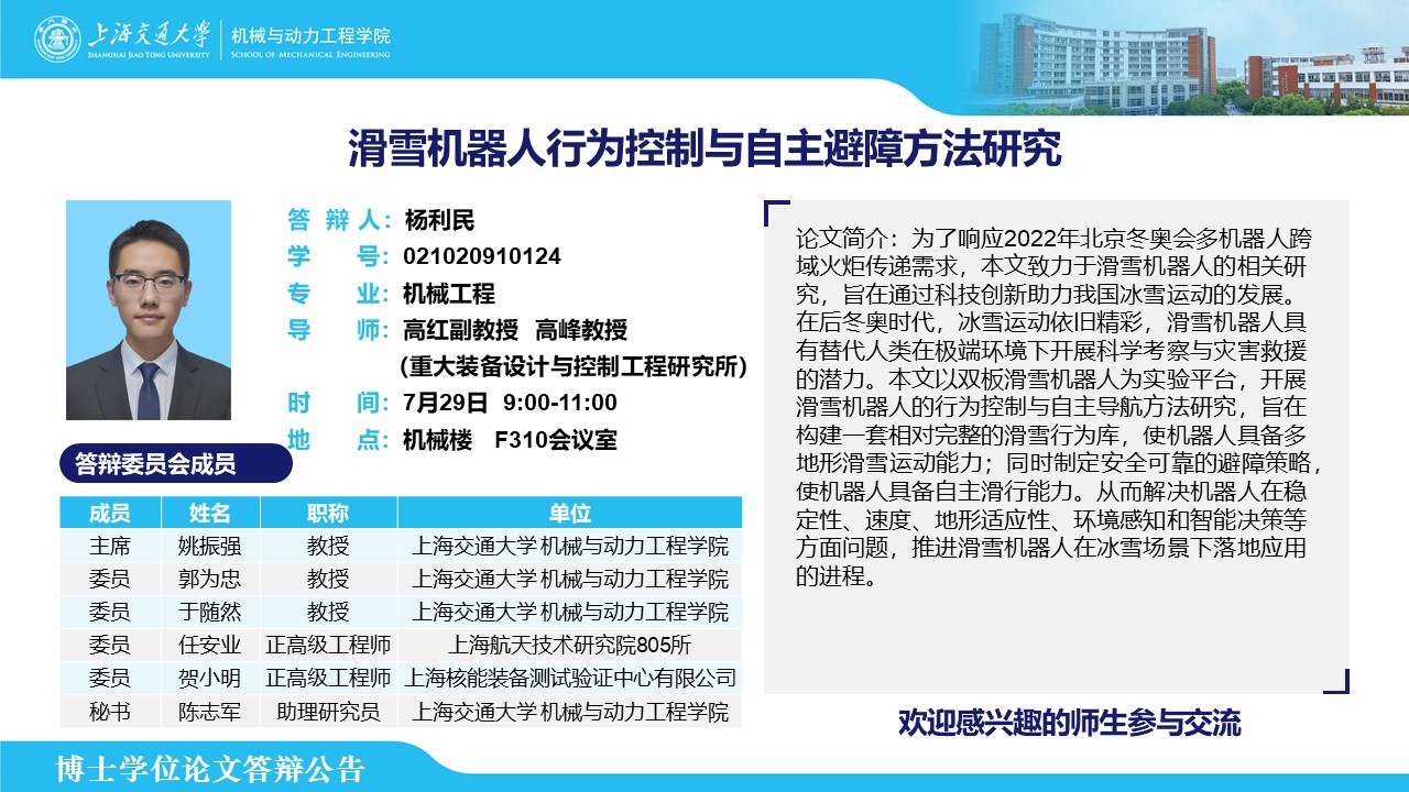 答辩人:杨利民 | 导师:高红、高峰 | 时间:7月29日 9:00-11:00 | 地点:机械楼 F310会议室