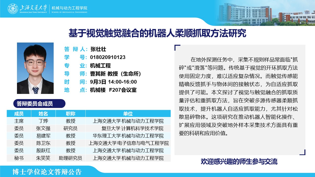 答辩人:张壮壮 | 导师:曹其新 | 时间:9月3日14:00-16:00 | 地点:机械楼 F207会议室