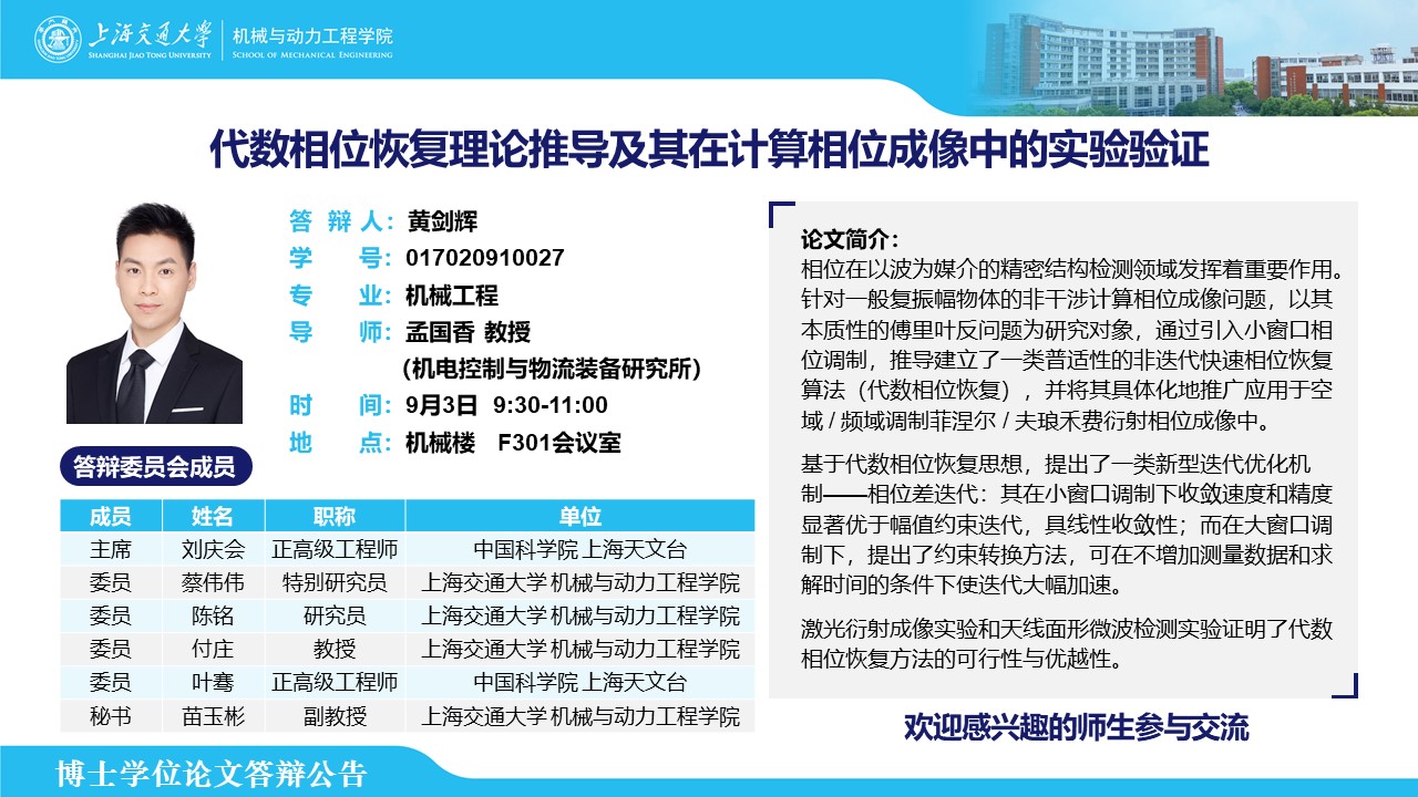 答辩人:黄剑辉 | 导师:孟国香 | 时间:9月3日 9:30-11:00 | 地点:机械楼 F301会议室