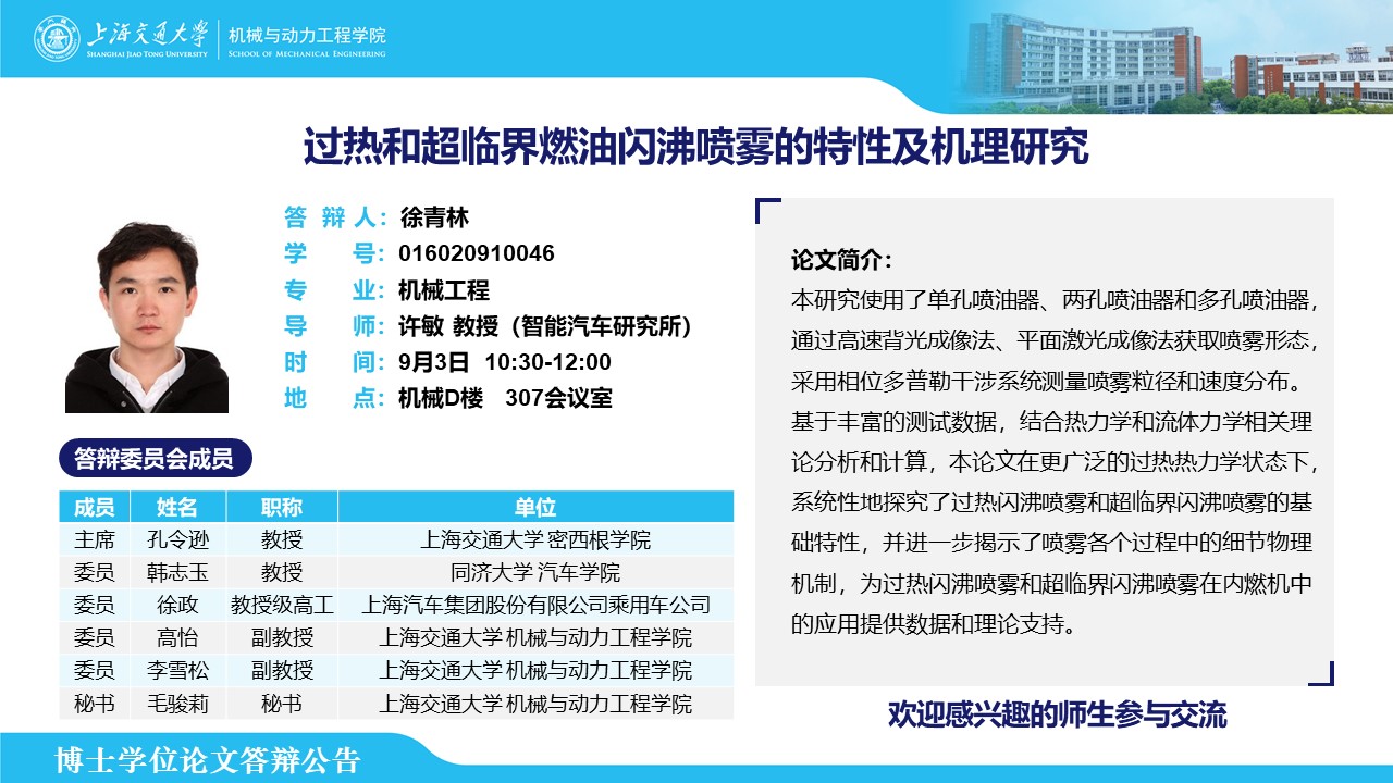 答辩人:徐青林 | 导师:许敏 | 时间:9月3日 10:30-12:00 | 地点:机械D楼 307会议室