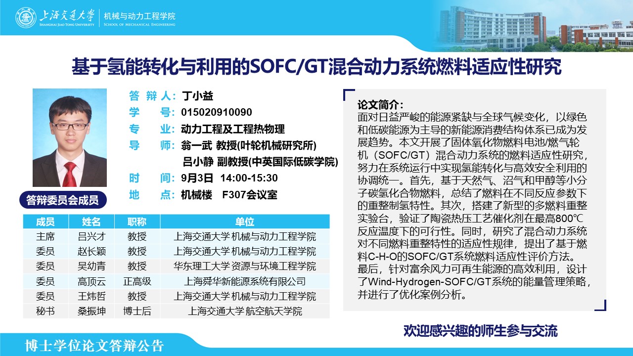 答辩人:丁小益 | 导师:翁一武 吕小静 | 时间:9月3日 14:00-15:30 | 地点:机械楼 F307会议室