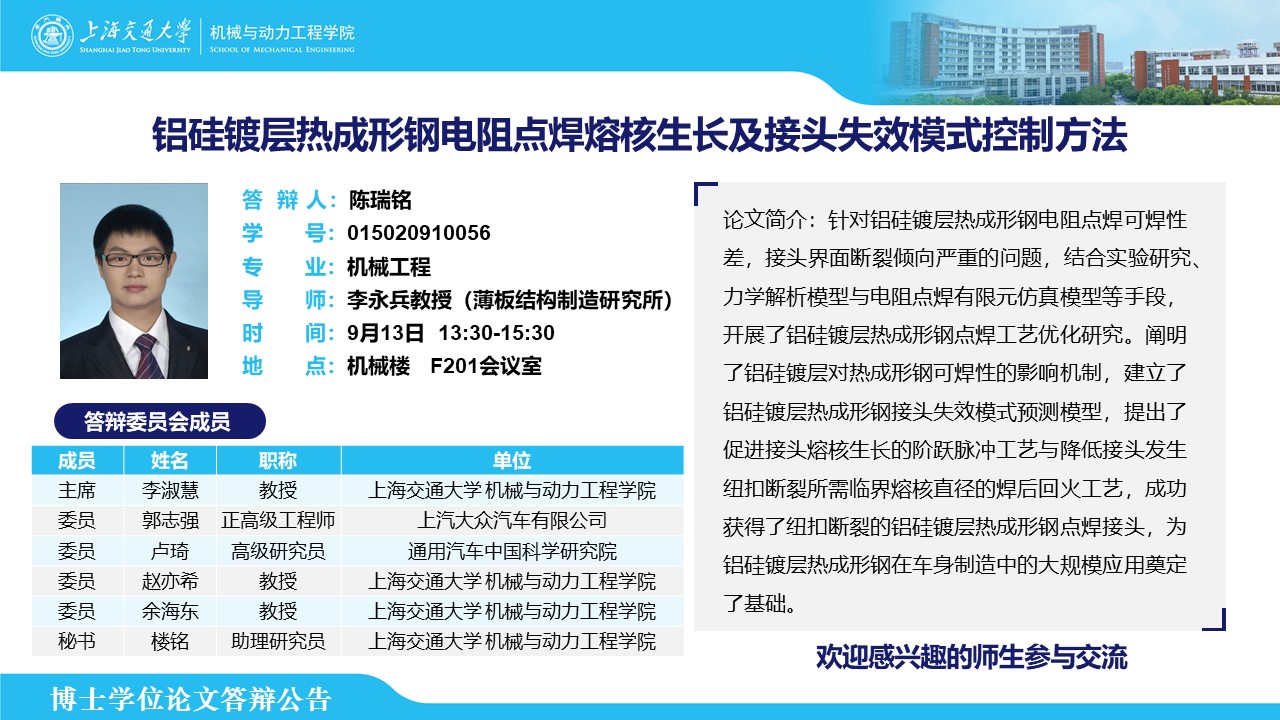 答辩人:陈瑞铭 | 导师:李永兵 | 时间:9月13日 13:30-15:30 | 地点:机械楼 F201会议室