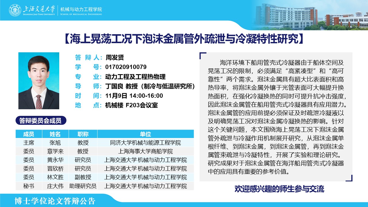 答辩人:周发贤 | 导师:丁国良 | 时间:11月9日 14:00-16:00 | 地点:机械楼F203会议室