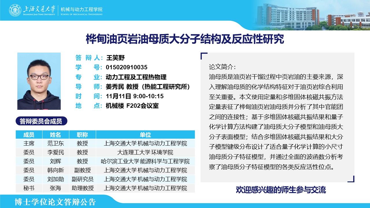 答辩人:王笑野 | 导师:姜秀民 | 时间:11月11日 9:00-10:15 | 地点:机械楼F202会议室