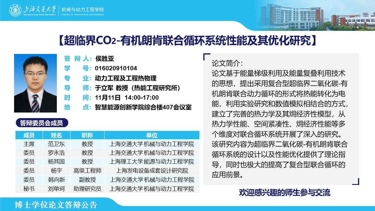 答辩人:侯胜亚 | 导师:于立军 | 时间:11月11日 14:00-17:00 | 地点:智慧能源创新学院综合楼407会议室