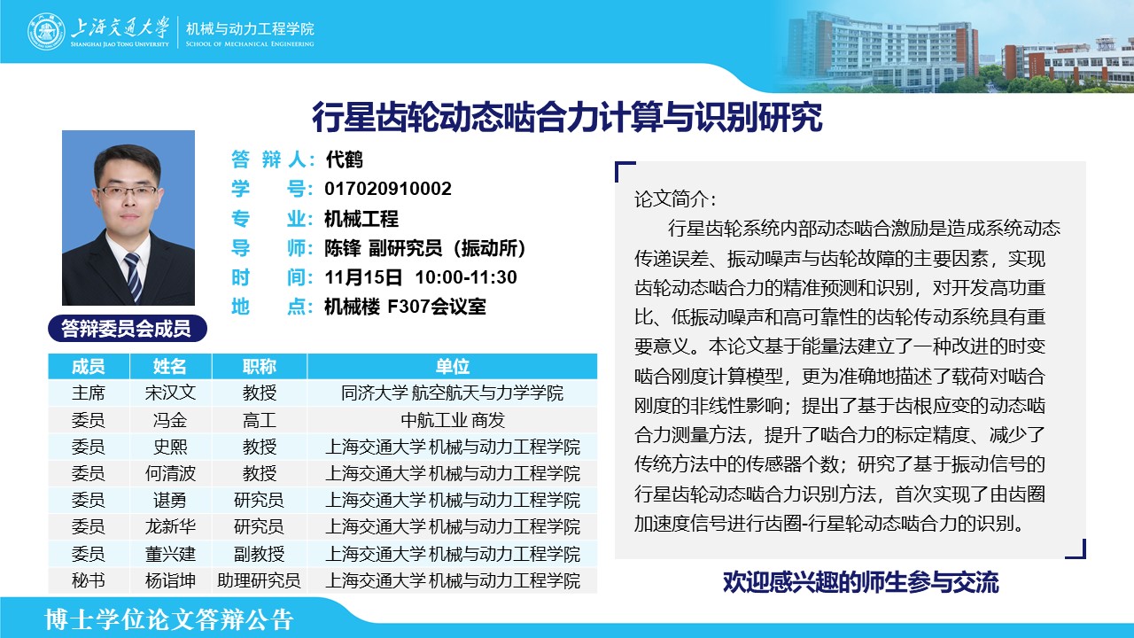 答辩人:代鹤 | 导师:陈锋 | 时间:11月15日 10:00-11:30 | 地点:机械楼F307会议室