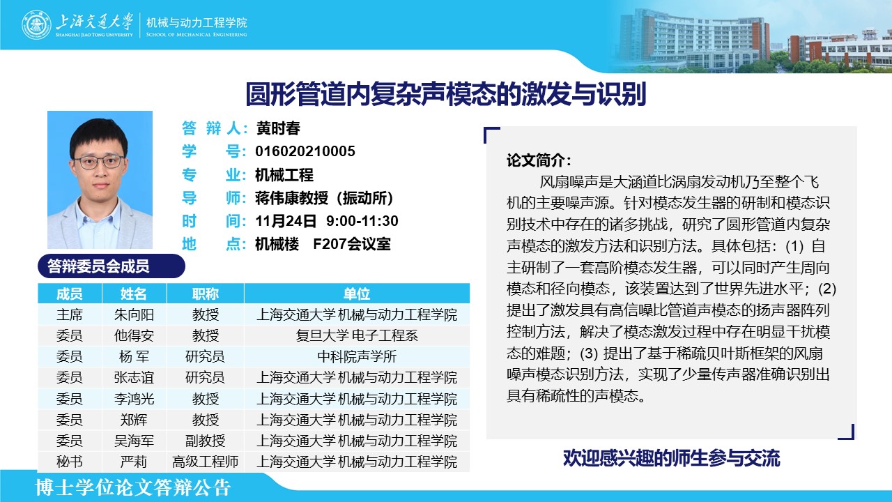 答辩人:黄时春 | 导师:蒋伟康 | 时间:11月24日 9:00-11:30 | 地点:机械楼F207会议室
