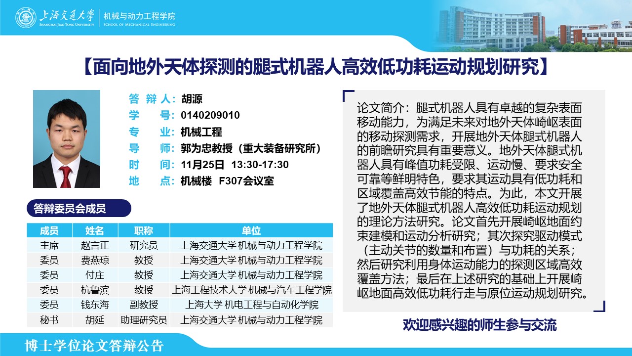 答辩人:胡源 | 导师:郭为忠 | 时间:11月25日 13:30-17:30 | 地点:机械楼F307会议室