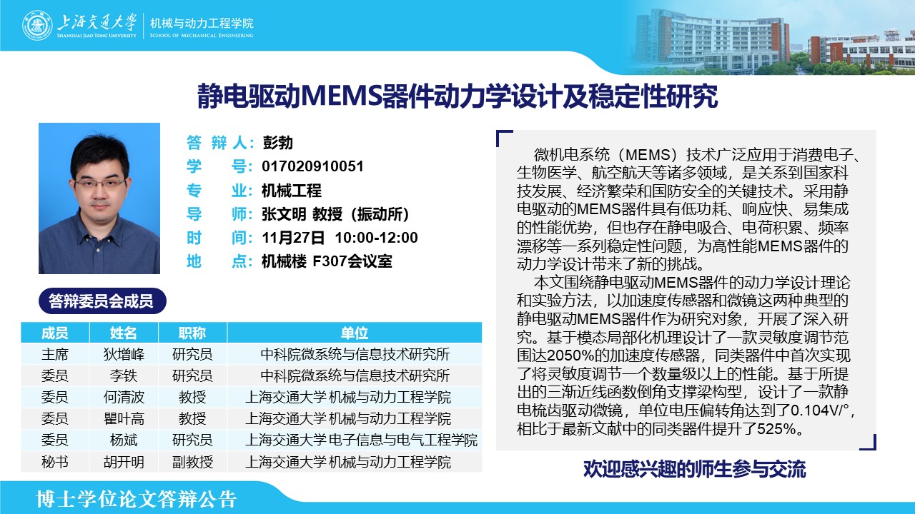答辩人:彭勃 | 导师:张文明 | 时间:11月27日 10:00-12:00 | 地点:机械楼F307会议室