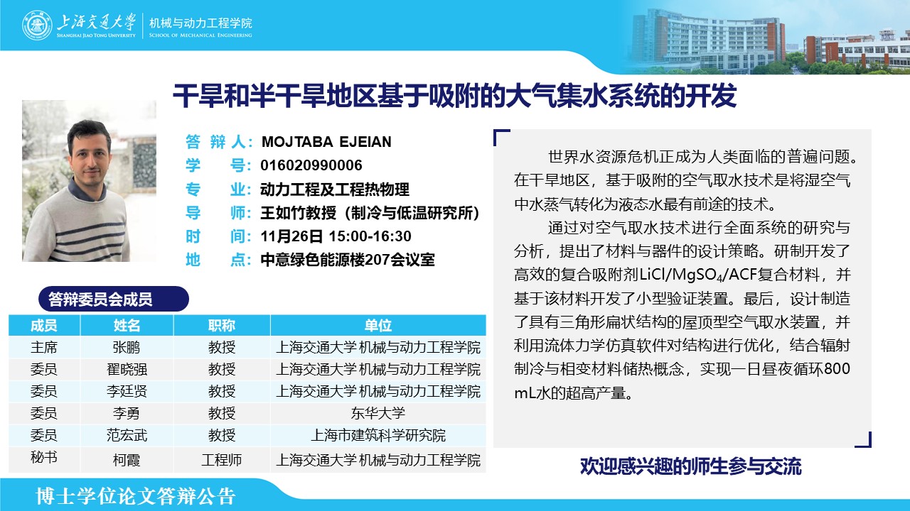 答辩人:MOJTABA EJEIAN | 导师:王如竹 | 时间:11月26日 15:00-16:30 | 地点:中意绿色能源楼207会议室