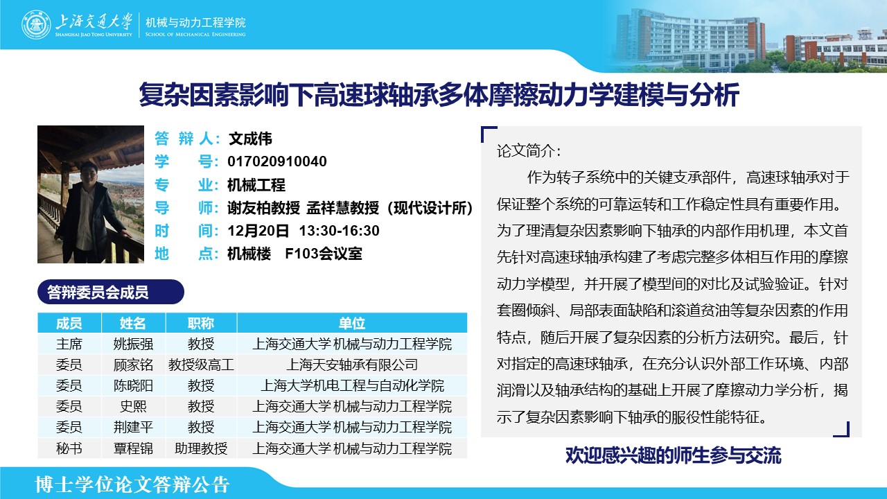 答辩人:文成伟 | 导师:谢友柏 孟祥慧 | 时间:12月20日 13:30-16:30 | 地点:机械楼F103会议室